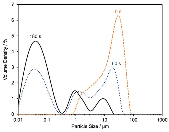 Particle size distribution of DQA in ethanol, after 0 s (dashed), 60 s (dotted) and 180 s (solid line) of ultrasonic treatment.