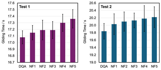 Running times over a measuring section with two photoelectric barriers for different ski gliding layers. The mean values are the result of four measurements, each with calibrated cross-country skis (old snow, 0.5–0.8 mm, no dirt; see Table 3 for the conditions). NF—non-fluorinated wax. DQA—2,9-dimethylquinacridone.