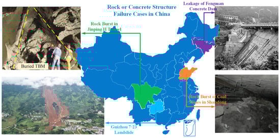 Typical failure cases of rock or concrete structures in China [2,3,4,5].