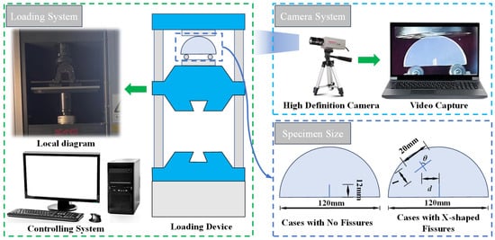 As pre-existing fissures have great impacts on rock strength [31,32], SCB specimens were utilized in our experiment with a semi-circular shape and a diameter of 120 mm. One guide fissure was prefabricated in the sample, with a length of 12 mm. The X-shaped fissure was also prefabricated in the specimen; the length of one X-shaped fissure was 20 mm, and the other was defined as l. The angle between two X-shaped fissures is defined as θ. In order to explore the effects of different X-shaped fissure angles θ, lengths l, and eccentricities d on the failure modes of SCB samples, different experimental schemes with various X-shaped fissure properties were designed and the details are listed in Table 1.