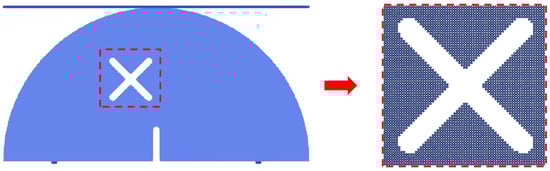 As the basic theories of SPH have been illustrated in many of the previous studies [30], we have only listed the core points of SPH failure equations. SPH has been widely applied in solid mechanics [33,34]. In order to characterize the failure processes of particles in SPH, the “activation state” coefficient η is introduced, and the improved smoothing kernel function A considering particle “activation” and “failure” is defined, which can consider each SPH particle to be “live” or “dead”. The numerical treatments are shown in Figure 3, and the smoothing kernel function A can be expressed as the product of the “activation state” coefficient η and the traditional smoothing kernel function W [25]: