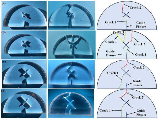 Figure 7 shows the fracture morphologies of SCB samples with different X-shaped fissure angles. As can be seen, for the circumstance of θ = 60°, crack 1 firstly initiates from the guide fissure tip, and propagates approximately to the center of the X-shaped fissure. Then, crack 2 is generated from the upper right of the X-shaped fissure and extends to the top of the specimen, resulting in the specimen failure. For the circumstance of θ = 90°, crack 1 initiates from the guide fissure tip, and overlaps with the center of the X-shaped fissure. Subsequently, three secondary cracks (crack 1, crack 2, and crack 3) are generated from the upper end of the X-shaped fissure, which expand to the specimen top and cause the failure. For the circumstance of θ = 120° and θ = 150°, crack 1 initiates from the guide fissure tip and overlaps with the center of the X-shaped fissure. Then, crack 2 and crack 3 are generated at the at the upper end of the X-shaped fissure. Finally, crack 2 and crack 3 expand to the top of the sample, leading to the specimen failure. It is worth noting that crack 2 and crack 3 converge at the upper loading point, making the fracture morphology of the entire sample symmetrical.