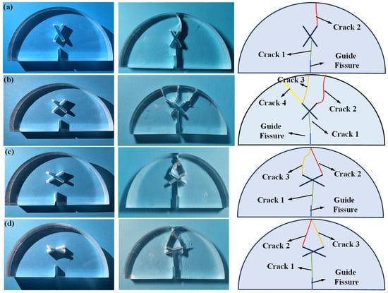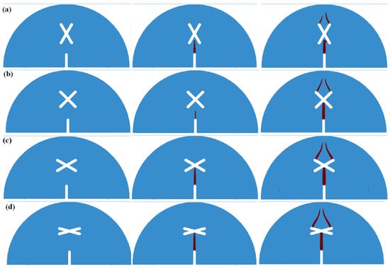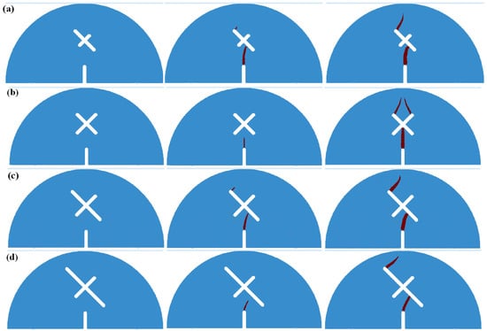 Figure 10 shows the simulation results of SCB specimens under scheme D. As can be seen, due to the symmetry of the model, crack propagation firstly occurs at the guide fissure tip, and then extends to the center of the X-shaped fissure. After that, cracks initiate from the two upper ends of the X-shaped fissure and extend symmetrically to the loading point of the model. The numerical results are highly consistent with the experimental results.