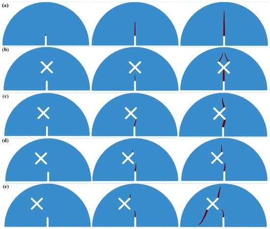 Numerical results of SCB specimen crack propagation under scheme A and scheme B. (a) Scheme A: no X-shaped fissures; (b) Scheme B1: d = 0 mm; (c) Scheme B2: d = 5 mm; (d) Scheme B3: d = 10 mm; (e) Scheme B4: d = 15 mm.