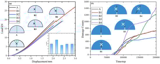 - The load–displacement curves of the SCB (semi-circular bending) specimens present three stages: an initial compaction stage, linear elastic deformation stage, and failure stage. The peak strength of SCB (semi-circular bending) specimens decrease first then increase with an increase in eccentricity d, and decrease with an increase in X-shaped fissure length as well as a decrease in X-shaped fissure angle. The damage counts remain 0 at the initial loading stage, corresponding to the initial compaction stage and the linear elastic deformation stage, but increase sharply at the later loading stage, corresponding to the failure stage, which is consistent with the experimental results.