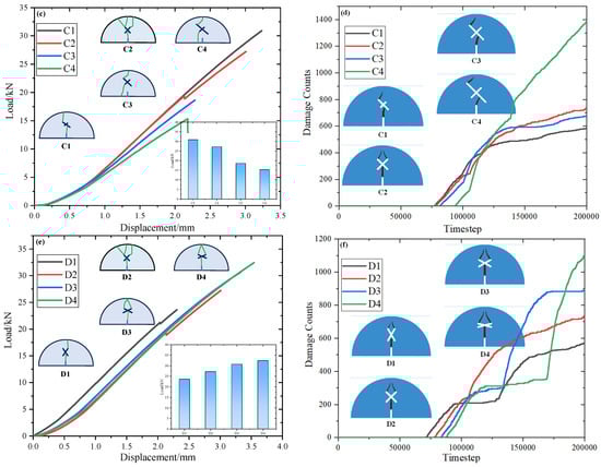 Figure 11 shows the effects of different X-shaped fissure angles θ, lengths l, and eccentricities d on the strength and damage counts of SCB specimens. As can be seen, the load–displacement curves of the SCB specimens can be divided into three stages: the first stage is the initial compaction stage, in which the load–displacement curve is concave, indicating that the cracks inside the samples are gradually compacted; the second stage is the linear elastic deformation stage, in which the load and displacement increase linearly and no damage occurs inside the SCB specimens; and the final stage is the failure stage, and the load drops sharply at this stage.