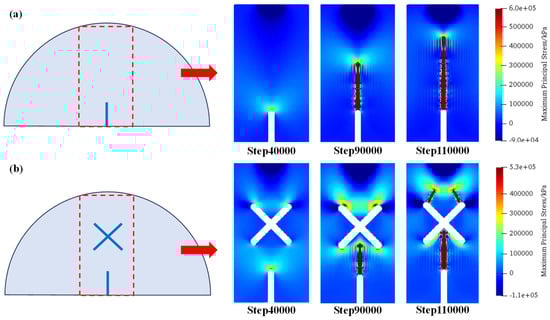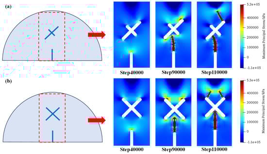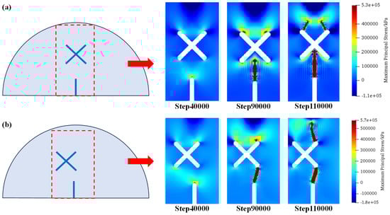 Figure 14 shows the distributions of maximum principal stress under scheme C1 and C2 at step 40,000, step 90,000, and step 110,000. As can be seen, compared with the conditions where the X-shaped fissure lengths are equal, the unequal fissure length intensifies the concentration of tensile stress at the upper end of the long fissure. Therefore, after the cracks initiate from the guide fissure and connect with the long X-shaped fissure, the upper tip of the X-shaped fissure produces crack propagation, which exhibits an asymmetric fracture morphology in scheme C1. However, in the circumstance of equal-length X-shaped fissures (scheme C2), the cracks are symmetrically generated from the two upper tips of the X-shaped fissures.