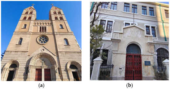 Historical buildings in the Qingdao: (a) the Qingdao Catholic Church; (b) the former site of Sacred Heart Convent.