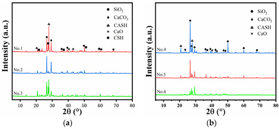 (a) XRD patterns of the Qingdao Catholic Church (No.1/No.2/No.3); (b) XRD patterns of the former site of Sacred Heart Convent (No.4/No.5/No.6).