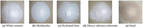 The preparation of the mortar samples followed a standardized procedure to ensure consistency across all the tests. Initially, the dry components (white cement, hydrated lime, heavy calcium carbonate, and metakaolin) were weighed and thoroughly mixed to achieve a uniform blend. The water required was then gradually added to the dry mixture while being continuously stirred to avoid lump formation. The mixing was performed using a mechanical mixer at a low speed for 30 s, followed by a high-speed mix for 90 s to ensure homogeneity.