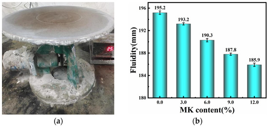 The fluidity test was conducted according to the standard GB/T 2419-2005 [26], “Test Method for Fluidity of Cement Mortar”. The fluidity of HLM with varying MK content was assessed using an NLD-3 type cement fluidity meter (see Figure 4a); the results are presented in Figure 4b.