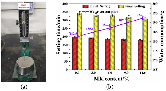 Based on the standard GB/T 1346-2011 [30], the water consumption for the standard consistency and the setting times of the different samples were measured using a Vicat apparatus [31] (see Figure 5a). The results of these measurements are displayed in Figure 5b.