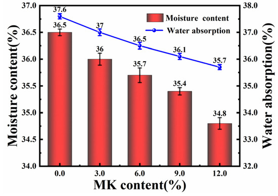 The moisture content and water absorption of the samples slightly decrease as the content of MK increases. Specifically, incorporating 6.0% MK results in a reduction of 2.1% in moisture content and a 2.4% decrease in water absorption. This trend intensifies with 12.0% MK, leading to a decrease of 4.5% in moisture content and 4.6% in water absorption. The likely reason behind this phenomenon is the substantial formation of hydration products due to MK addition, which renders the HLM denser and less porous [36]. Although the permeability and breathability levels of HLM modified with MK are reduced, they still maintain a relatively high level. Such characteristics are crucial for preserving the breathability and permeability of materials, especially in the restoration of historical structures where maintaining a moisture balance is key. The enhanced breathability of the material allows water movement through the structure, averting moisture accumulation within the walls and minimizing the risks of issues like condensation or dampness. Furthermore, this property helps prevent the accumulation of detrimental elements like moisture and mold within the walls [37]. The use of non-breathable, impermeable materials can interfere with the moisture balance in walls and accelerate their degradation.