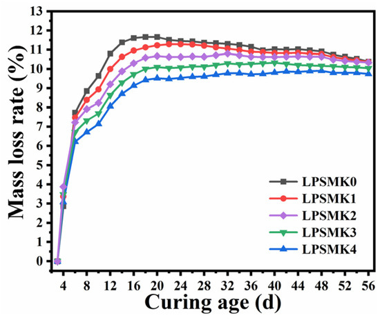 The mortar specimens were weighed immediately after demolding. Subsequently, the specimens were weighed every two days, and the rate of mass loss was calculated. The mass loss rate is defined as the percentage reduction in mass of a material over time [38]. It is a critical parameter in assessing the durability and longevity of materials in various conditions. In this context, the mass loss rate of the HLM specimens was tracked and plotted over the curing period, as illustrated in Figure 7.