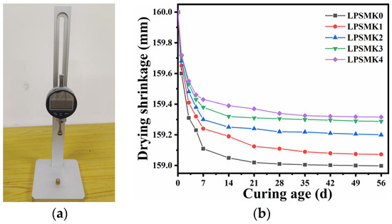 In accordance with the “Standard for Test Methods of Basic Properties of Construction Mortar” (JGJ/T 70-2009) [34], prismatic specimens with dimensions of 40 mm × 40 mm × 160 mm were prepared. Three sets of specimens were prepared for each group, and the arithmetic mean value was taken as the drying shrinkage value. The lengths of the specimens were gauged using a precision vertical mortar shrinkage device (see Figure 8a), calibrated to detect minute variations, to enhance measurement accuracy. The trend of dry shrinkage variation in the samples was determined by comparing the measured lengths with the starting lengths of the samples. Figure 8b presents the findings.
