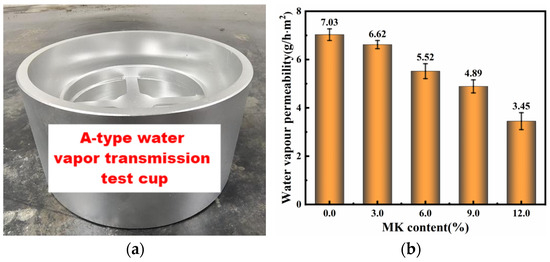 (a) A-type water vapor transmission test cup; (b) water vapor transmission properties of HLM with different contents of MK.