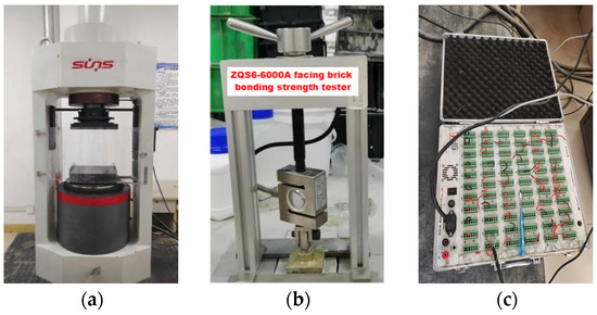 (a) YAW-3000 Microcomputer-Controlled Electro-Hydraulic Servo Testing Machine; (b) ZQS6-6000A facing brick bonding strength tester (Zhongke Beigong Group Ltd., Cangzhou, China); (c) DH3816 static stress and strain acquisition instrument (Donghua Group Ltd., Yancheng, China).