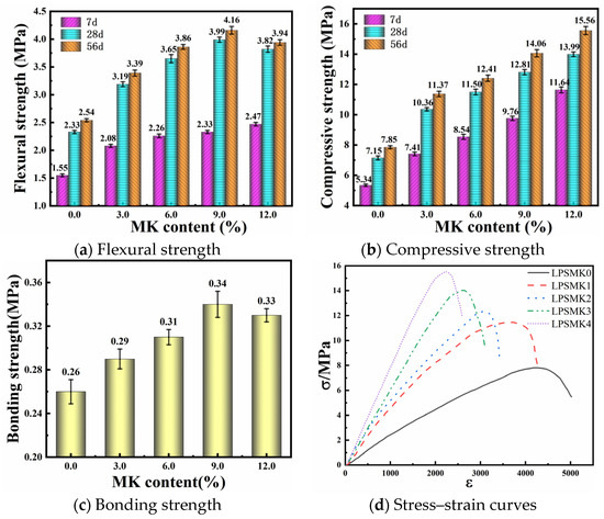 - The elastic properties and stress–strain curves indicated that the elastic modulus of the mortar increased significantly with the addition of MK, enhancing the material’s rigidity and crack resistance.