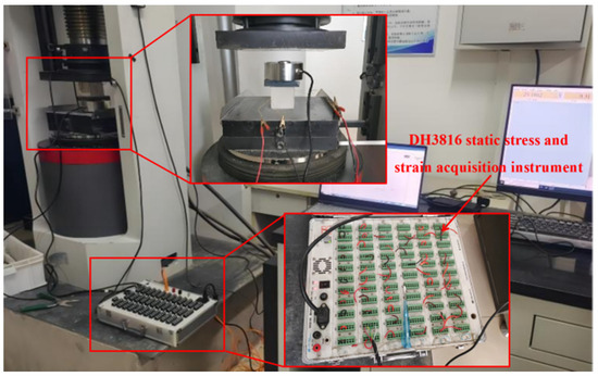 The elastic properties and stress–strain curves of the specimens were evaluated following the guidelines of “Standard for Test Methods of Basic Properties of Construction Mortar” (JGJ/T 70-2009). Cube specimens, each with dimensions of 70.7 mm × 70.7 mm × 70.7 mm, were utilized. Strain gauges were affixed longitudinally and transversely at symmetrical positions along the midline on the sides of each specimen to record strain during compression. The testing was conducted using a YAW-3000 Microcomputer-Controlled Electro-Hydraulic Servo Testing Machine, with a load application rate of 0.8 kN/s. A pressure sensor was placed between the specimen and the testing machine to capture real-time axial pressure, ensuring accuracy. The DH3816 static stress and strain acquisition instrument (see Figure 10c) was used to gather data on stress and strain throughout the testing process. These tests provided valuable information on the mortar’s elastic modulus and Poisson’s ratio. The schematic diagram of the test is shown in Figure 12.