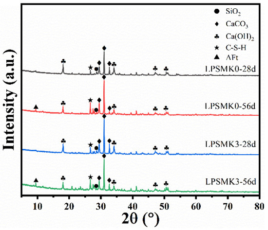 For XRD analysis, the mortar samples were cured for 28 and 56 days. Following the curing process, the samples were oven-dried at 60 °C to remove any residual moisture. The dried samples were then ground into a fine powder using a mechanical grinder. The ground samples were passed through a 200-mesh sieve to ensure uniform particle size. Approximately 1 g of the sieved powder was collected for analysis. The powdered samples were placed into an XRD sample holder, ensuring an even and compact surface. The XRD analysis was conducted to determine the phase composition of the mortar samples. The XRD patterns of the LPSMK0 and LPSMK3 mortars at 28 days and 56 days are shown in Figure 13.