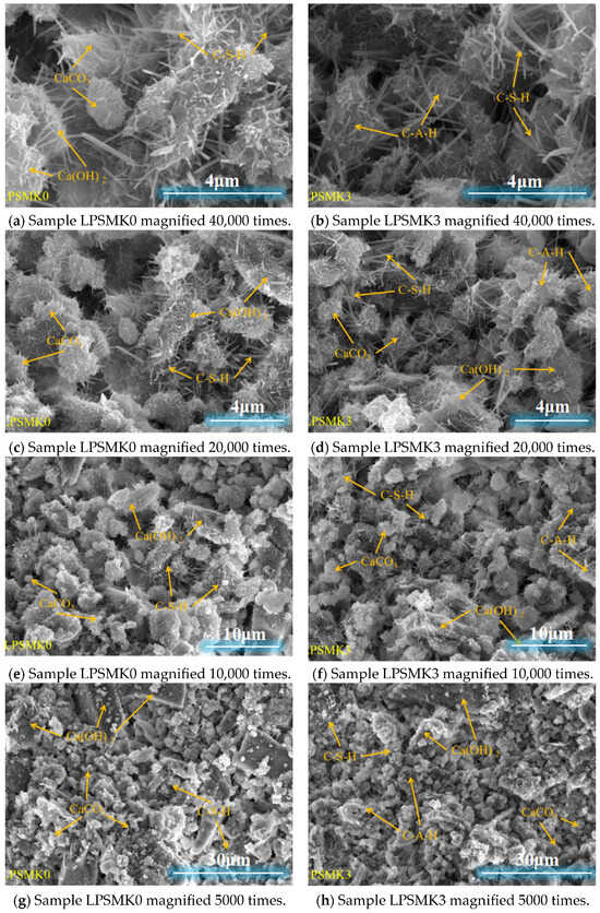 As observed in Figure 14, compared to the LPSMK0 group without MK, the LPSMK3 group with 9.0% MK demonstrates notable changes in microstructure. Compared to the LPSMK0 specimen, the LPSMK3 specimen exhibits a reduction in the number of flake-like structures, a decrease in spherical structures, and a significant increase in needle-like structures. According to the literature [40], the flaky substances are identified as Ca(OH)2, the spherical substances as CaCO3, and the needle-like substances as C-S-H. These structures intertwine to form a spatial network, embedding small CaCO3 particles within the hydration products, thereby reducing pore size and densifying the microstructure. This finding suggests that increasing the MK content causes more complete hydration processes, which consume more Ca(OH)2 and produce more hydration products.