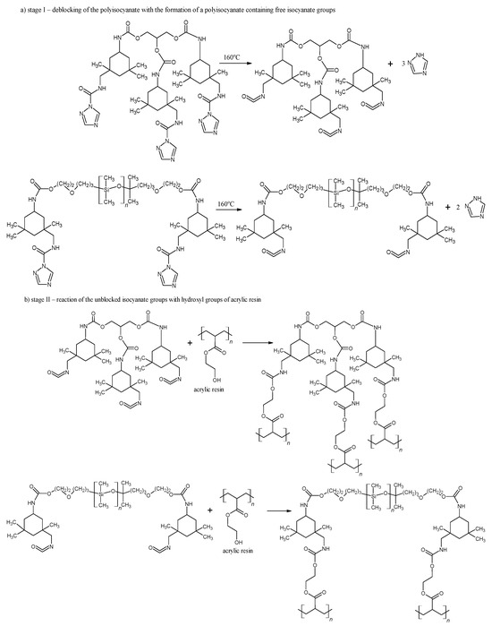 In the literature, the known blocking agents are imidazoles, amides, oximes, phenols, triazoles, imides, pyrazoles, hydroxyamic acid esters, and active methylene compounds [14,15]. Czachor-Jadacka et al. described crosslinking agents based on blocked polyisocyanates that induce curing at reduced temperatures. An example is methyl ethyl ketoxime (MEKO)-blocked PICs or butanone oxime, which, compared to ε-caprolactam-blocked PICs, undergo deblocking at temperatures below 160 °C rather than 180 °C [16].
