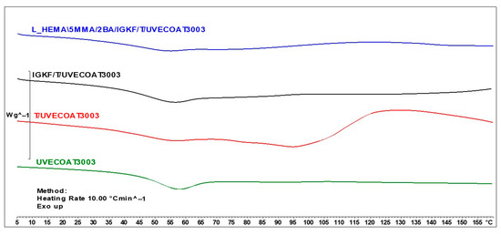 DSC curves of UVECOAT 3003, T/UVECOAT 3003, IGKF/T/UVECOAT 3003, and L_HEMA/5MMA/2BA/IGKF/T/UVECOAT 3003.
