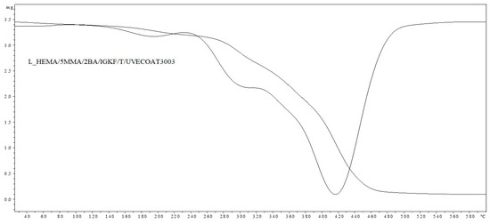 TGA and DTG curves of L_HEMA/5MMA/2BA/IGKF/T/UVECOAT 3003.