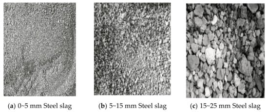 The steel slag used in this experiment was produced by Baosteel Group Corporation Limited in Shanghai and is basic oxygen furnace (BOF) slag. The slag used in the experiment had been stored for 12 months after production, with particle sizes of 0~5 mm, 5~15 mm, and 15~25 mm, corresponding to the limestone particle sizes mentioned above, as shown in Figure 2.