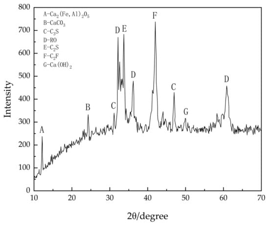 The XRD results are shown in Figure 3, which indicated that the main chemical components present in steel slag include iron-aluminum-calcium, calcium hydroxide, calcium carbonate, tricalcium silicate, as well as some phases of RO, dicalcium silicate, and free calcium oxide. Further examination of the spectra revealed the presence of numerous peaks, indicating the presence of various minerals in the steel slag.