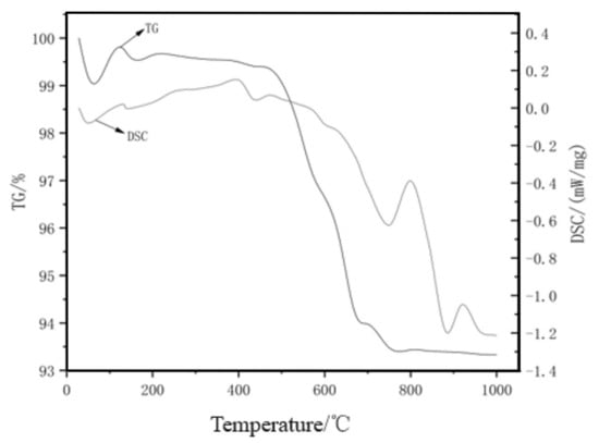 To measure the mass change and heat flow change of steel slag at different temperatures, a NETZSCH 449F3 Synchronous Thermal Analyzer was used in the test. The temperature range was set from 40 to 1000 °C, with a heating rate of 10 °C/min. The results are shown in Figure 5.