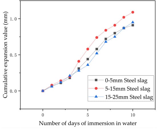 From Figure 6, it is evident that the cumulative expansion of steel slag increased with the immersion time for each grain size. Initially, over the first three days, this expansion showed a nearly linear progression. Subsequently, after the third day, the rate of cumulative expansion accelerated, slowing down again after the seventh day. Overall, the cumulative expansion for each particle size steadily increased with longer immersion times, with a noticeable slowing in the rate of increase beyond the seventh day.
