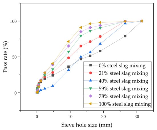 Six steel slag substitution rates of 0%, 21%, 40%, 59%, 78%, and 100% were selected, and the specific ratios are shown in Table 4. The corresponding grades were fitted to the curves, as shown in Figure 7.