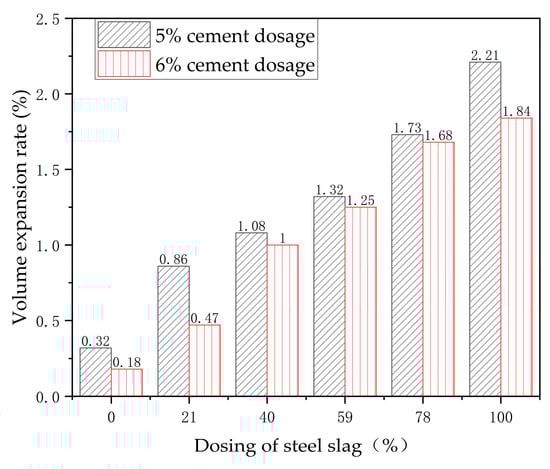 - It was found that the volume expansion rate of cement-stabilized gravel mixtures with different steel slag dosages over seven days, in the case of cement dosages of 5% and 6%, in the natural state increased with the gradual increase of steel slag substitution, and when the dosage reached 59%, it was no longer suitable for use in actual projects.