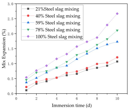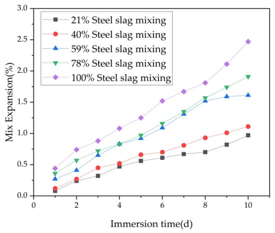 The expansion changes in the steel slag mixture after immersion are mainly attributed to the contact between steel slag and water. The reactive substances contained in steel slag react with water, resulting in expansion and causing the mixture to expand accordingly. Therefore, under the same immersion time conditions, there is an inherent connection between the overall volume expansion changes of the steel slag mixture and the expansion of the steel slag material itself.