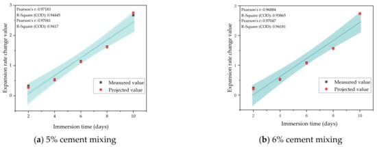 Fitting results of the predicted and actual values of the expansion rate of the mixture at 5% and 6% cement content.