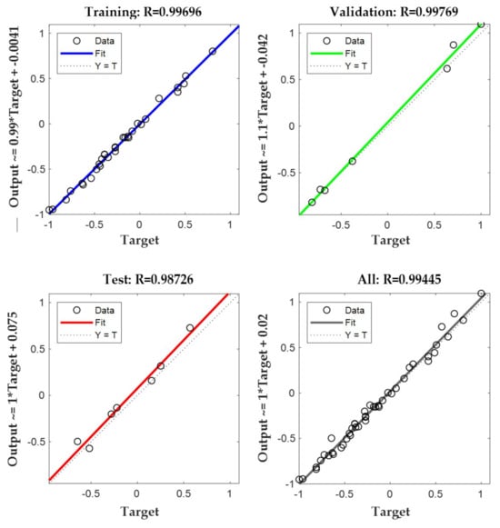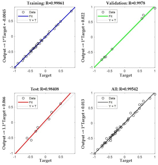 In the prediction with the BP neural network, the more the correlation coefficient of the samples converged to 1, the more it indicated that the results of the training of the model were satisfactory. After the model training, the correlation results were as shown in Figure 12 and Figure 13.