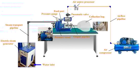 The experimental platform is shown in Figure 2. In this study, a total of 6 experiments were carried out according to the set pressure values (Table 2) in the pressure vessel. Specifically, a pre-prepared 60 g sepiolite sample (particle size smaller than 2 cm) was put into a pressure vessel, and then high-temperature steam was injected into the vessel via an electric steam generator (rated working pressure of 0.7 MPa, rated saturated-steam temperature of 171 °C). When the pressure inside the pressure vessel reached the set value, the pressure was instantly unloaded through a pneumatic valve. Finally, the sepiolite powder in the pressure vessel flowed into the collection bag through the output pipeline. The principle of preparing sepiolite powder using this method is shown in Figure 3. The samples were denoted as SEP-0.1, SEP-0.2, SEP-0.3, SEP-0.4, SEP-0.5, and SEP-0.6 according to the pressure in the vessel. The sample (SEP-ext) prepared with mechanical extrusion (XPF175, Jiangxi Weiming Machinery Equipment Co., Ltd., Ganzhou, China) was used as the contrast sample to analyze the effects of the proposed method on the fiber structure and adsorption property of sepiolite.