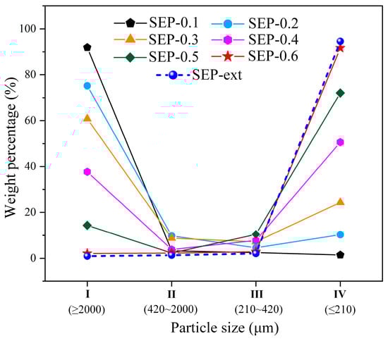 The sepiolite powders obtained in the experiment were classified according to particle size by using standard sieves. The particle size distribution of the samples is shown in Figure 4. When the pressure values were 0.1~0.3 MPa, the weight percentages of powder in classification I (d ≥ 2000 μm) reached more than 60%, and the weight percentages of powder in classification IV (d ≤ 210 μm) did not exceed 25%. This indicates that the sepiolite splintering effect is not ideal under these pressure values. When pressure values were 0.4~0.6 MPa, the weight percentages of powder in classification I decreased significantly to 37.6%, 14.3%, and 2.1%, respectively, and the weight percentages of powder in classification IV increased significantly to 50.6%, 72.1%, and 91.6%, respectively. It is thus proven that this method can make a sample of sepiolite split into powder with a smaller particle size. The greater the steam pressure, the higher the amount of powder obtained with a smaller particle size. In addition, Figure 4 shows that for both samples SEP-0.6 and SEP-ext, the weight percentage of powder with the particle size of classification IV (d ≤ 210 μm) was more than 90%, indicating that sepiolite powder can be prepared effectively using the method proposed in this paper.