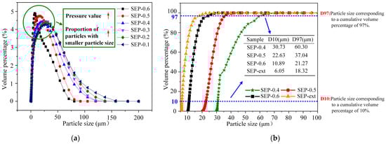 Considering the limitation of standard sieve measurement, a laser particle size analyzer was used to accurately measure the particle size distribution of the sepiolite powders (d ≤ 210 μm). As shown in Figure 5a, with the increase in steam pressure, the proportion of sepiolite powders with particle sizes ranging from 0 to 50 μm gradually increased. In the powder processing industry, D10 and D97 are two important indexes for evaluating powder size in powder production and application. The D97 values of the samples SEP-0.4, SEP-0.5, and SEP-0.6 (Figure 5b) are 60.30, 37.04, and 21.27 μm, respectively, indicating that the particle sizes of powders greatly decreased as the steam pressures increased. The gaps between the D97 and D10 values of samples SEP-0.4, SEP-0.5, and SEP-0.6 are 29.57, 14.41, and 10.38 μm, respectively. Obviously, the higher the steam pressure value, the more concentrated the particle size distribution of the powder. In general, compared to the sample SEP-ext, although the particle size of sample SEP-0.6 is slightly larger, the distribution is more concentrated, which indicates that the method proposed in this paper has potential for applications in the powder processing industry.