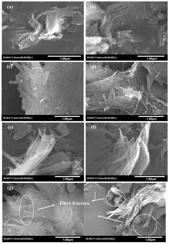 To reveal the changes in the morphological characteristics of sepiolite achieved with steam pressure changes and mechanical extrusion, the SEM images of the samples are discussed here. In the SEP-0.1 and SEP-0.2 samples (Figure 6a,b), the sepiolite appears as a tightly bound aggregate, and the fibers are barely visible. In the SEP-0.3 sample (Figure 6c), large bundles formed by tightly bound fibers are observed, and no fibers are found to be dispersed. In the SEP-0.4 sample (Figure 6d), fluffy bundles and rod-like fibers dispersed from these bundles can be observed in a few areas. In the SEP-0.5 (Figure 6e) and SEP-0.6 (Figure 6f) samples, a larger range of fluffy bundles can be clearly observed. The above results show that with the increase in pressure, the tightly agglomerated bundles gradually become fluffy, and the textural porosity (inter-fiber microporosity and mesoporosity) may gradually increase. However, in the SEP-ext sample, the sepiolite still appears to be a tightly bound aggregate, the bundles are not fluffy, and some fibers with a shorter length are observed, which could have been caused by the disruption of original fibers (Figure 6g).