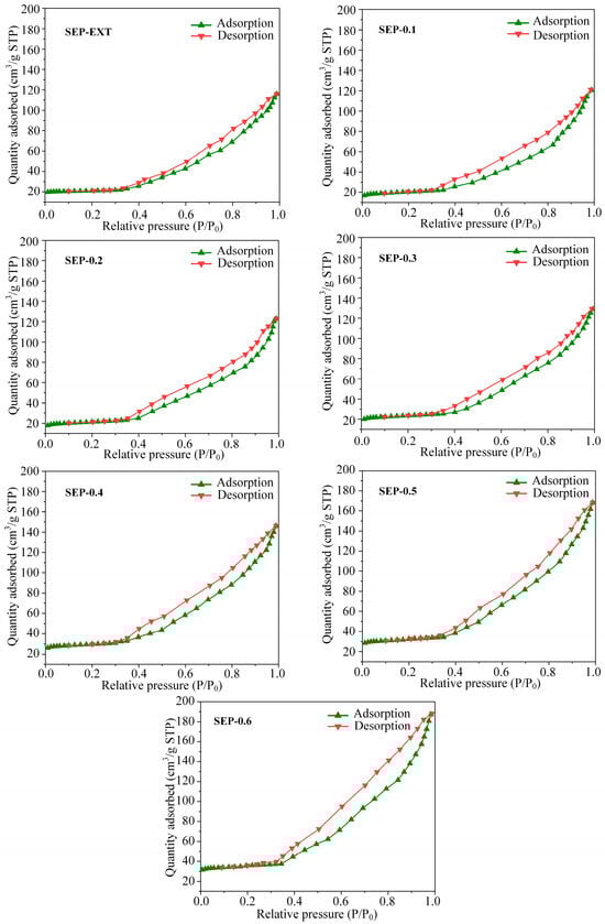 Adsorptiveness is one of the important properties that determines the application value of sepiolite, and it is mainly evaluated using microstructural parameters, especially the specific surface area [33,34]. Based on the analysis of its effect on the morphological characteristics of sepiolite, it can be found that the steam pressure change treatment has an influence on the microporosity of sepiolite, as shown in Figure 6. Therefore, it is necessary to analyze the effect of steam pressure change treatment on the microstructure parameters of sepiolite. Figure 9 shows that the nitrogen adsorption–desorption curves of sepiolite belong to a type IV isotherm containing an H3-type hysteresis loop. This indicates that the internal pore structure of sepiolite is very irregular. Moreover, with the increase in the pressure, the adsorption capacity of the samples continues to increase in the range of relative pressure P/P0 > 0.9. This may have been caused by the gradual increase in large pores inside the sepiolite.