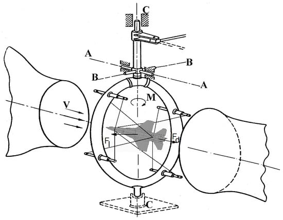 The carbon fiber composite airframe of the aerial target was manufactured by the MSP InnTech Ltd. (Warsaw, Poland) [18,19] while the 1:4 scale aircraft model for wind tunnel testing was designed and “printed” using FDM (Fused Deposition Modelling) technology at the MUT. Experimental tests were carried out in a low-speed wind tunnel with a test space diameter of D = 1.1 m. The silhouette of the model under test, suspended on an annular aerodynamic balance for testing in symmetric and asymmetric flow, is shown in Figure 1, while Figure 2 shows a schematic of the measurement system in the wind tunnel. The methodology and calculation program for aerodynamic characteristics were developed based on the literature [20,21,22,23,24,25,26,27,28].