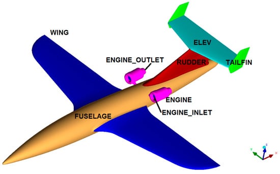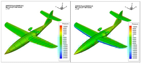 A non-structural mesh was generated in the area surrounding the aircraft airframe. The rectangular domain around the model size of 40 × 40 × 20 m represented half of the geometry. Five layers of prism cells simulating the boundary layer were generated around the walls of the aircraft. The thickness of the first mesh element (0.6 mm) corresponded to the turbulence parameter y+ in the range <30–200>, which is recommended for the Spalart–Allmaras turbulence model used. This model is adopted as a standard in the analysis of external flows, especially in the range of Reynolds numbers used in aviation [31]. The selected mesh size and turbulence model allowed for obtaining reliable results with a reasonable calculation time. The influence of the turbulence model in terms of comparison presented in this work [38] shows no significant change in the characteristics corresponding to the linear part of the CL change.