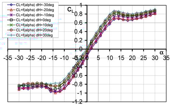 Characteristics of CL = f(α) for different elevator deflection angles dH.