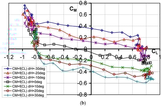 (a) Characteristics of Cm = f(α) for different elevator deflection angles dH. (b) Characteristics of Cm = f(CL) for different elevator deflection angles dH.