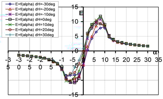 The aerodynamic efficiency curves as a function of the AOA E = f(α, dH) are shown in Figure 7, while, in Table 4, the numerical values at the characteristic points are shown.