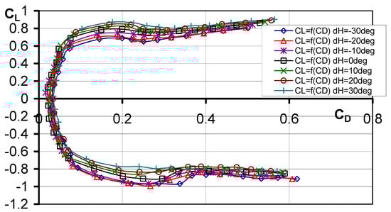 As can be seen in the graphs, for all the configurations of the tested models, the optimum angle of attack is αopt = 8°. The maximum value of aerodynamic efficiency was obtained for dH = 0°.