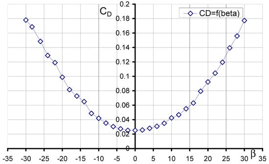 The characteristic of the CD drag force coefficient as a function of the sideslip angle β is shown in Figure 9. The characteristic has a parabolic shape. It is almost symmetric about the OY axis. During the tests, the maximum value of the drag force coefficient CD = 0.178 was obtained for both the sideslip angles β = −30° and β = 30°.