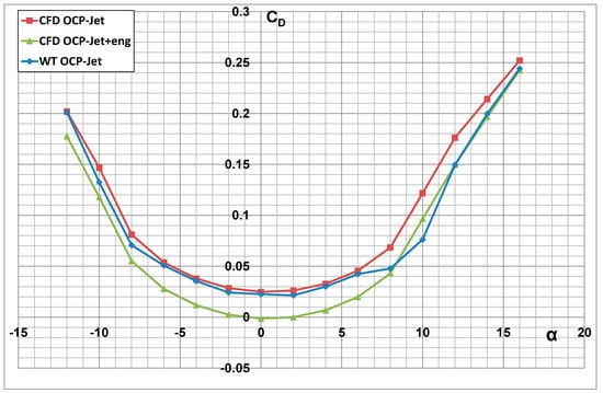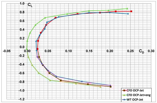 Comparison of CL = f(CD) characteristics of an aerial target with engine thrust effect (CFD OCP-Jet-eng) and without (CFD OCP-Jet).